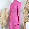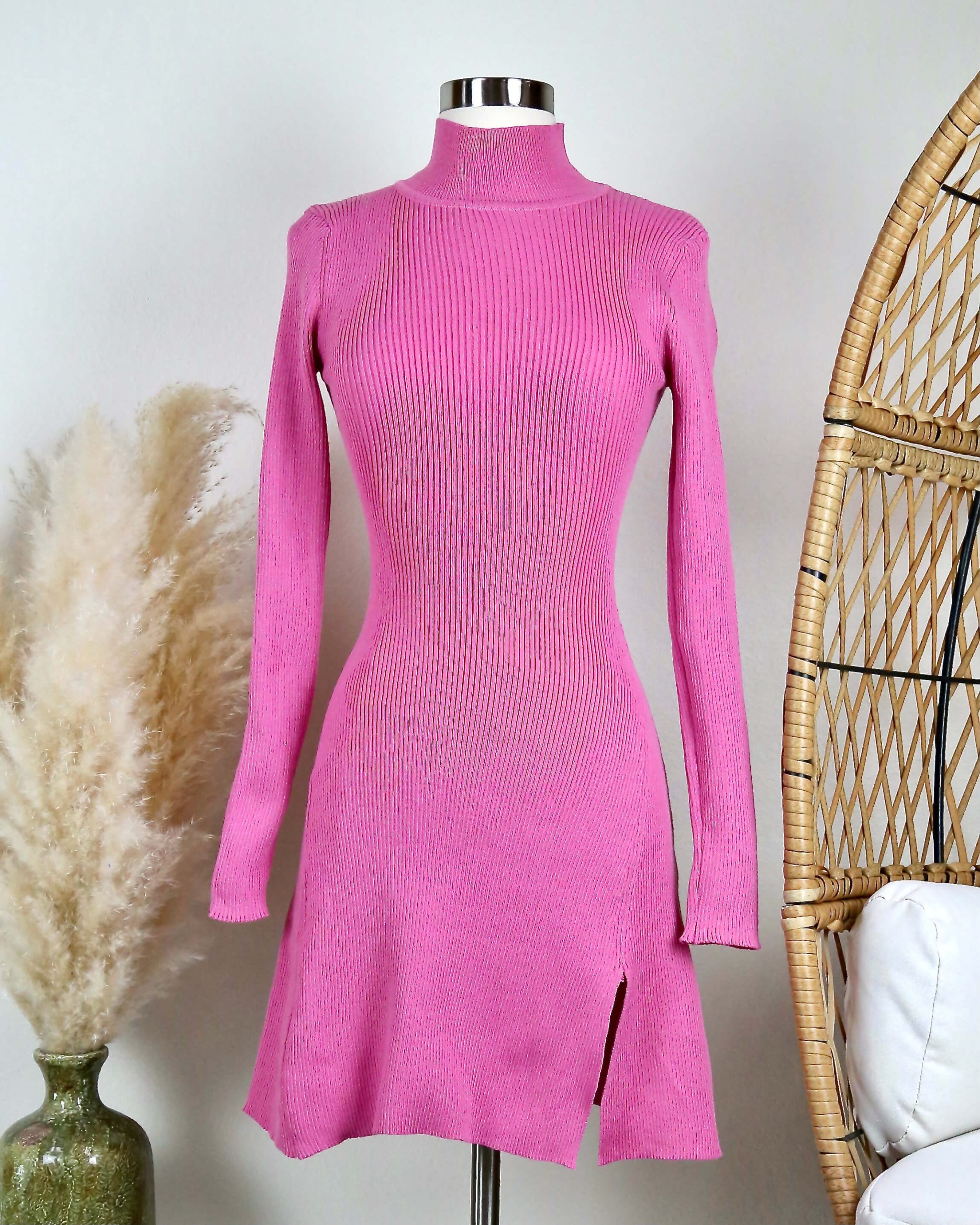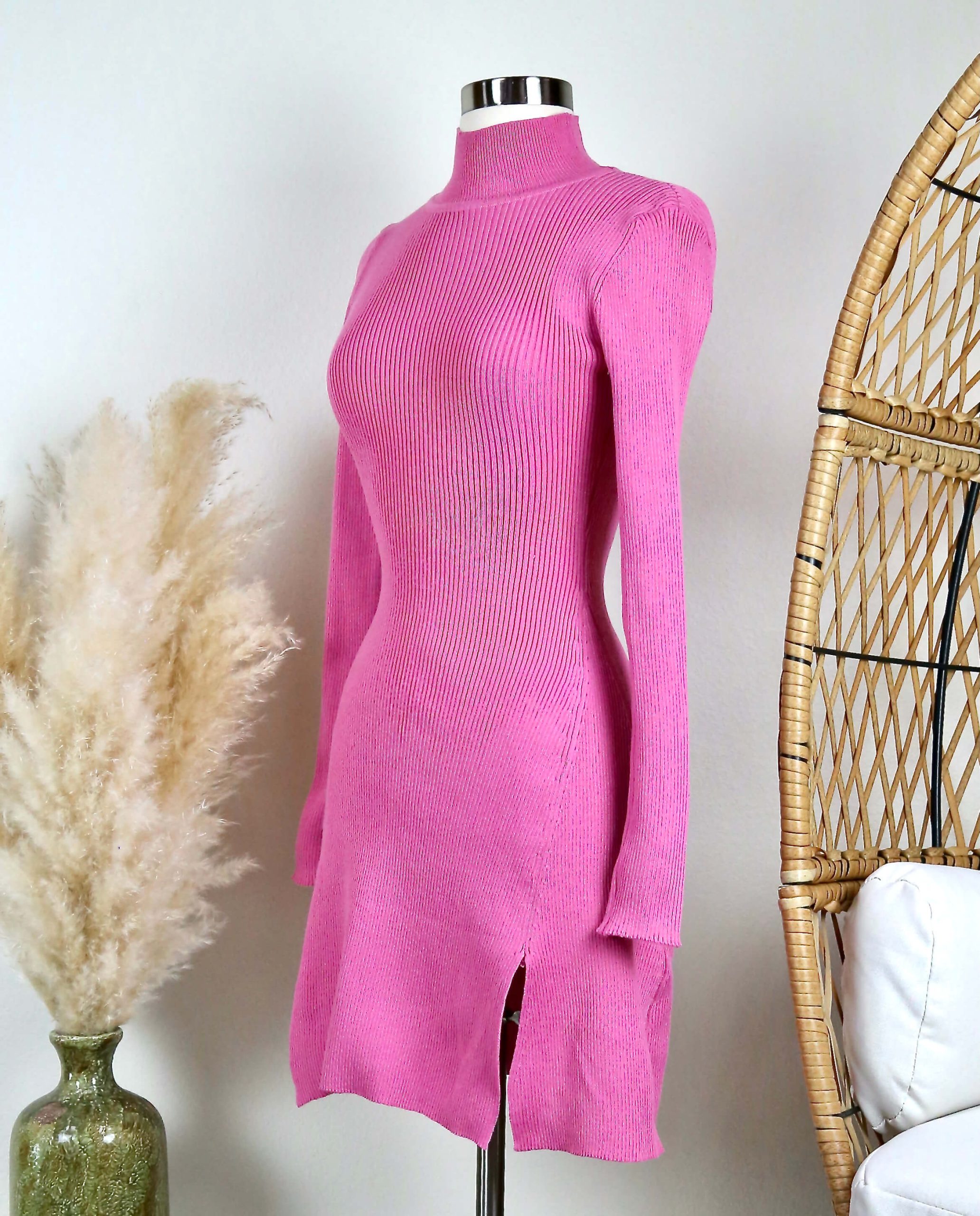 This gorgeous magenta toned dress features a mock neck, long sleeves, and a subtle side slit to further feminize this cute dress.