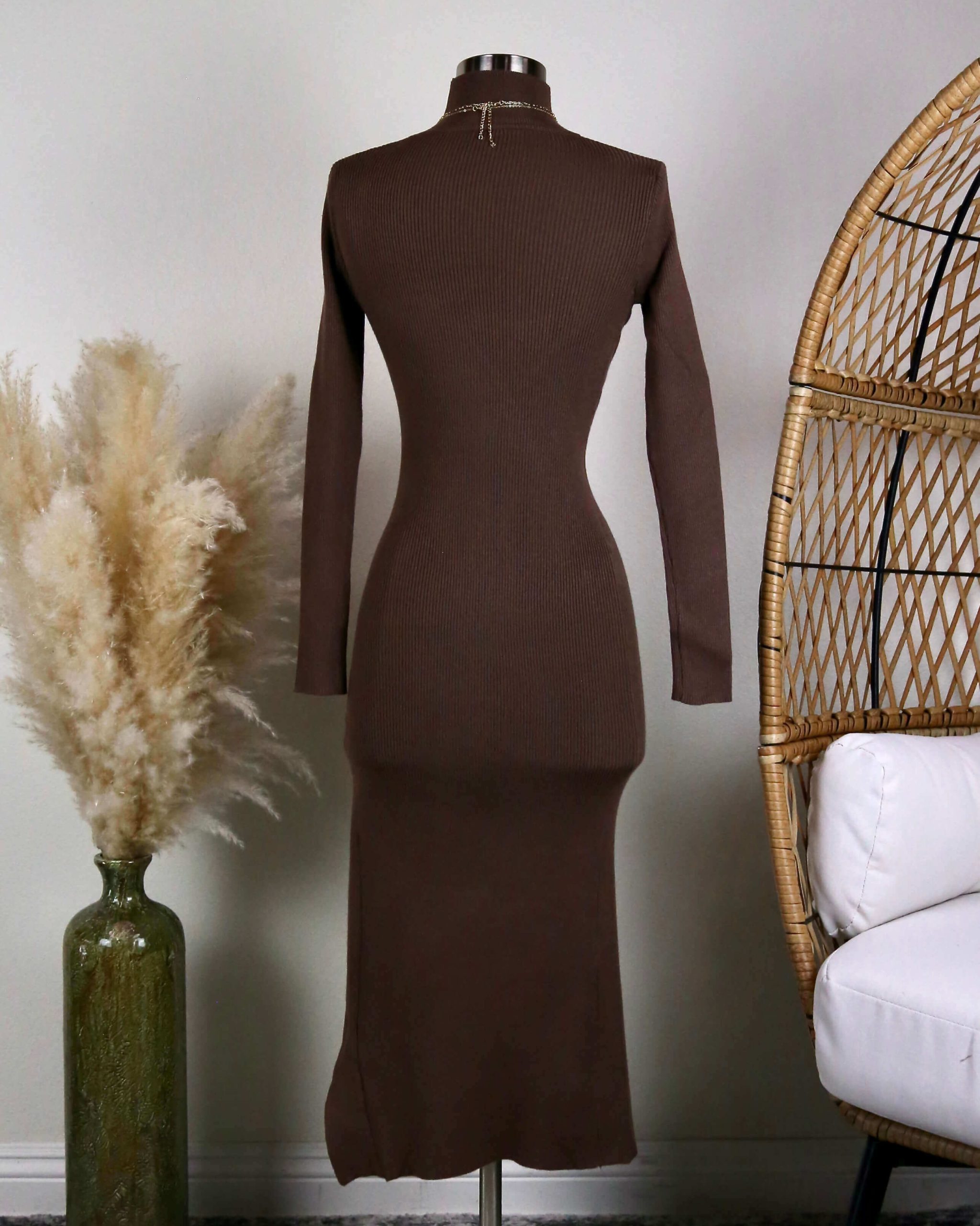 Long Sleeve Ribbed Bodycon Midi Dress With Side Slit in Brown