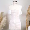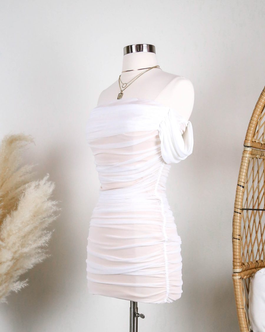The cutest dress featuring a strapless square neck design, back zip closure, ruched detailing throughout, and an off the shoulder sleeves. Nude lining with a white mesh overlay.