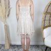 This dress is a dream come true. The braided straps creates a support for the buttoned up bodice and crochet-trim neckline. This gorgeous Woolberetset dream dress features a godet-style skirt with a beige lace overlay extending down and dotted-mesh panels. Pair this with neutral lace overlay heels and pearl jewelries. There is no such thing as too much lace!