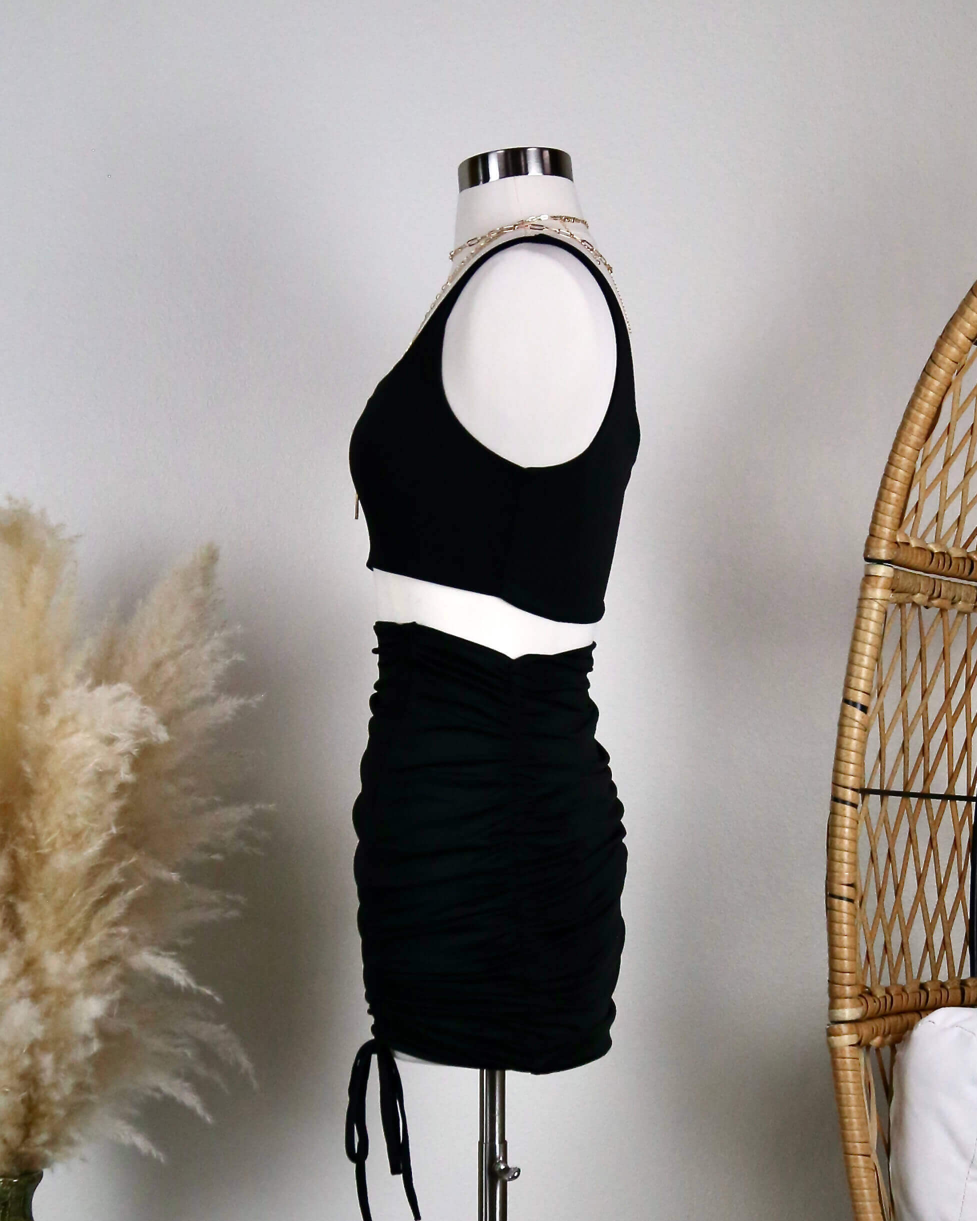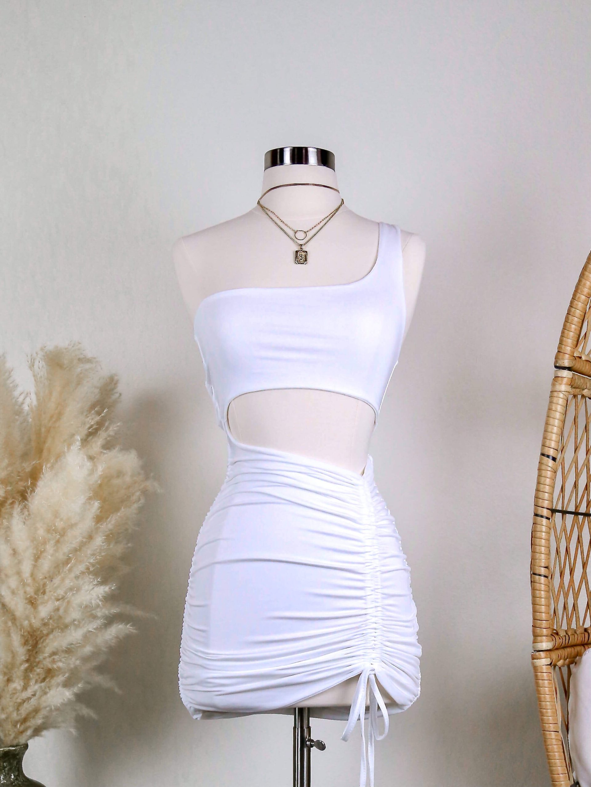 Be the life of the party in this trendy and edgy ruched one shoulder dress. The popular one shoulder neckline, double lined stretchy soft fabric, adjustable side drawstring and ruched detailing make this dress super flattering.
