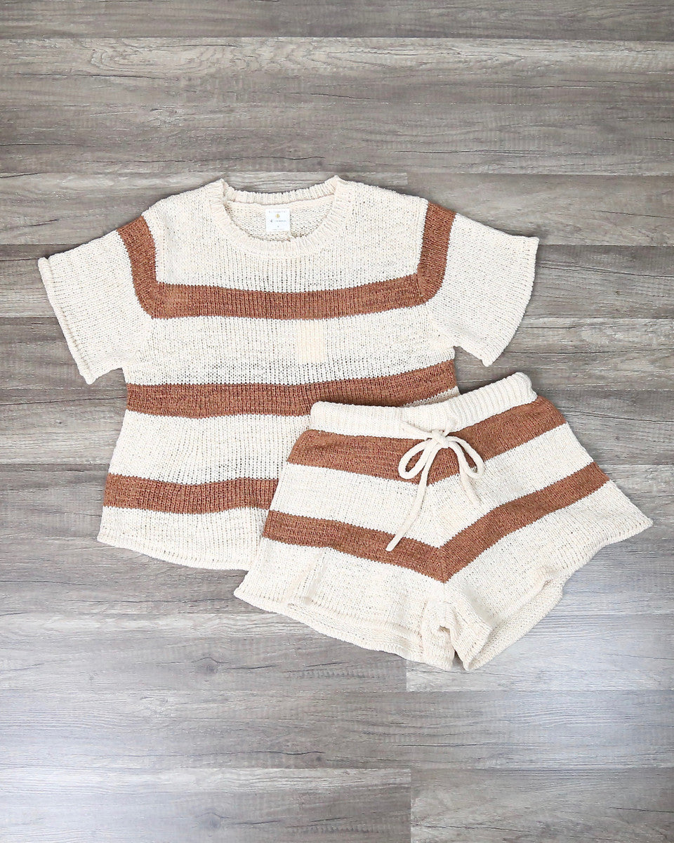 This super cute knit shorts featured in a camel ivory color is a piece you don’t want to miss out on! It’s comfy, cute, and casual. It’s the perfect pair of shorts to lounge in or to go out in, it’s versatile! Wear this with the matching Stripe Knit Top in Camel Ivory for a super cute look!