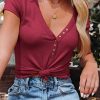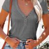 Short Sleeve V Neck Button Ribbed Knit T-shirt